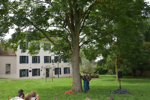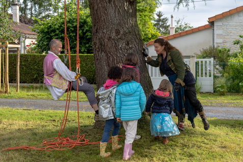 À votre arrivée, vous serez accueilli par Mr Mike : entre deux voyages en montgolfière, cet aéronaute, un poil ronchon et pas très bavard, est venu rendre visite à ses amis des arbres. Mike vous guidera et vous installera au pied de l'Arbre et en y regardant bien, le nez en l'air, calés dans l'herbe, vous devinerez deux silhouettes cachées, perchées dans la densité du feuillage : Côsme & Lila.